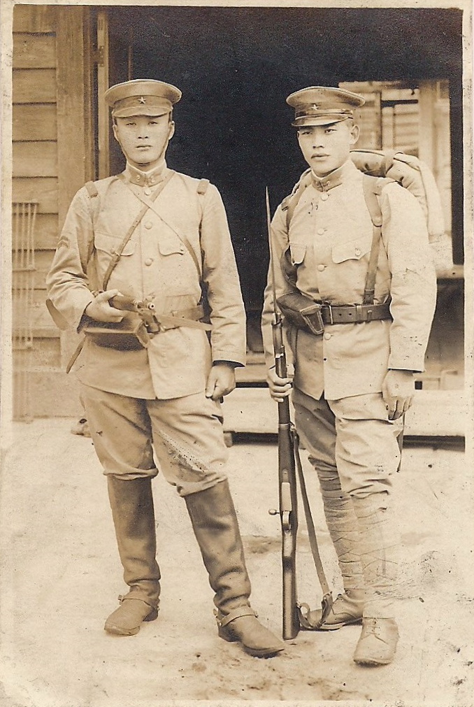 | A Japanese officer and soldier pose wearing their combat gear. |