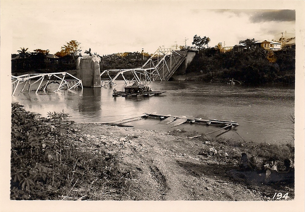 | An M8 Greyhound on a pontoon ferry is transported across a river. The bridge was blown by retreating Japanese troops. Photograph # 194 |