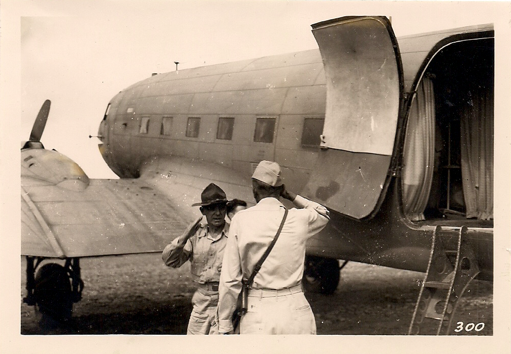 | General Stillwell salutes a soldier as he steps off a C-47 Transport plane on Negros island. Photograph #300 |