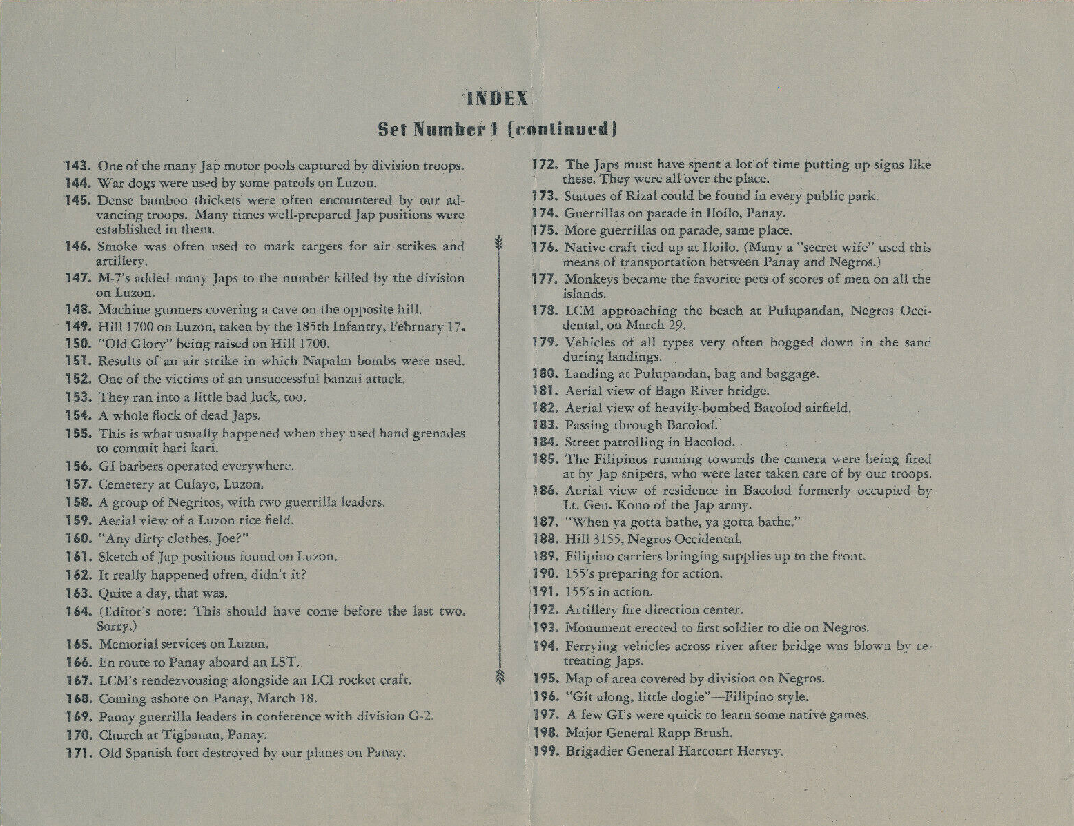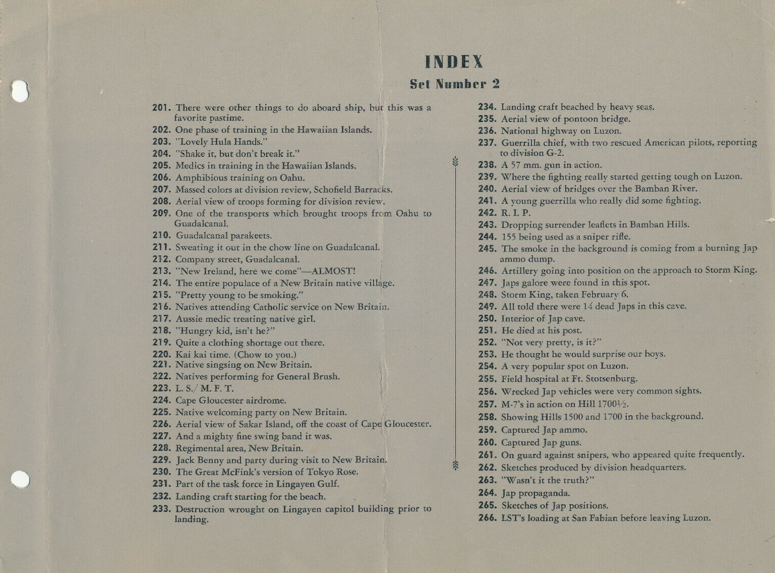 | Photos removed from the "40th Division Overseas Official Photographs Album". The album contained 200 pictures numbered between 100 and 300. The album spans the years 1942 to 1945. |