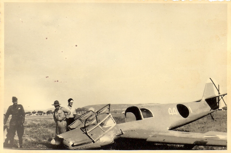 | A Messerschmitt Bf 108 Taifun has crash landed. The Bf 108 was utilized as a liaison aircraft. |