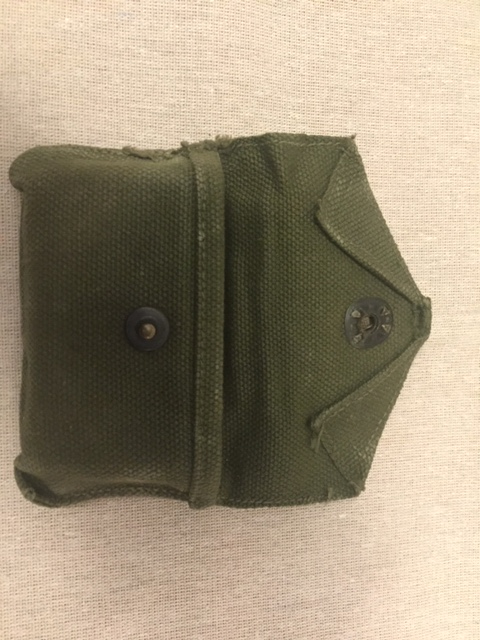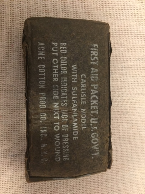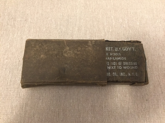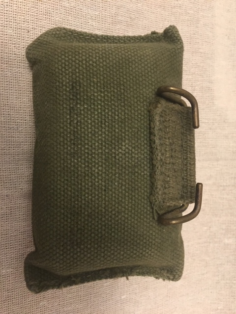 | WW2 era US Gov\'t First Aid Packet with green web belt pouch and sealed Carlisle bandage inside. |
