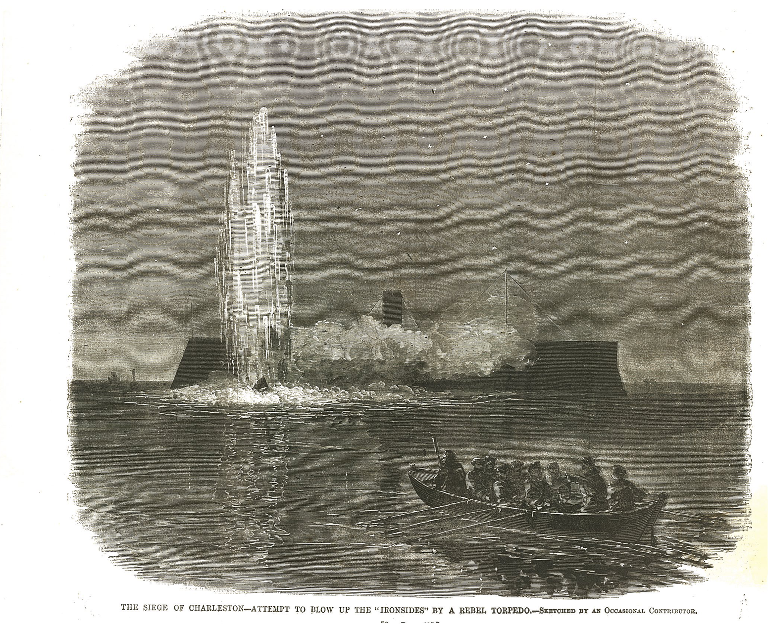 | Page from 1863 Harper's Weekly depicting a rebel attack on a ship in Charleston Harbor. |
