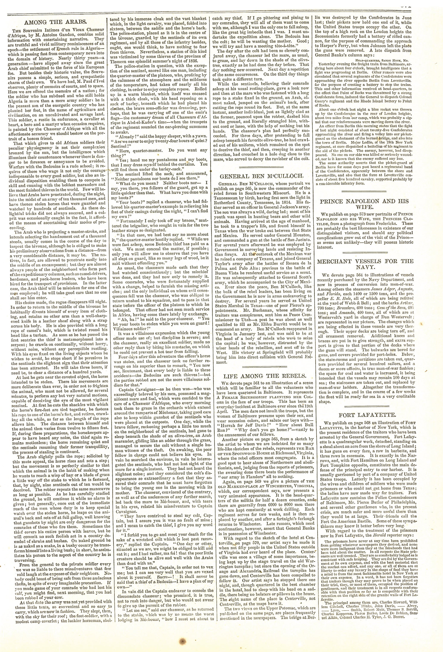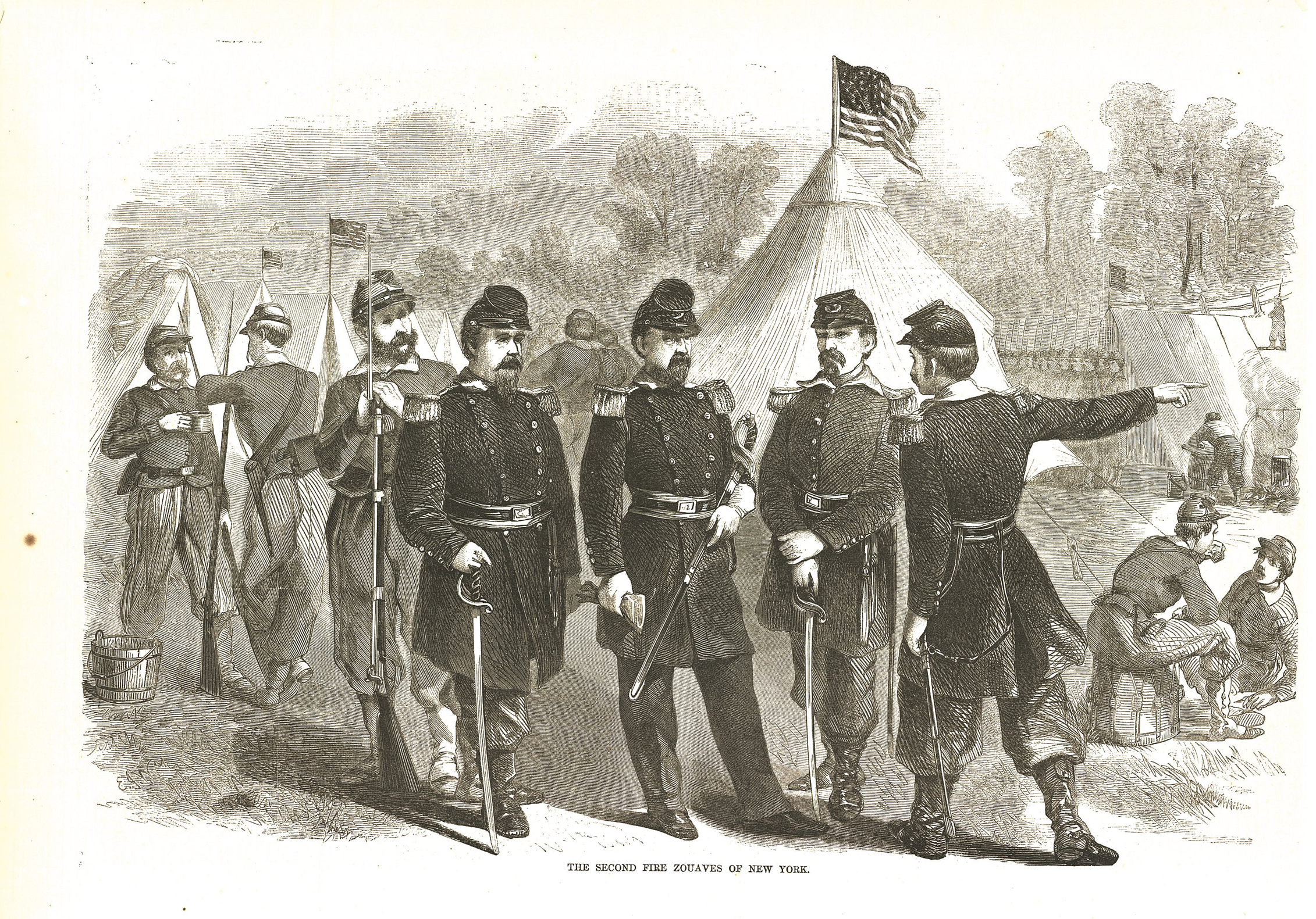 | Page from Harper's Weekly in 1861 depicting the officers and men of the 2nd Fire Zouaves of New York in camp. |