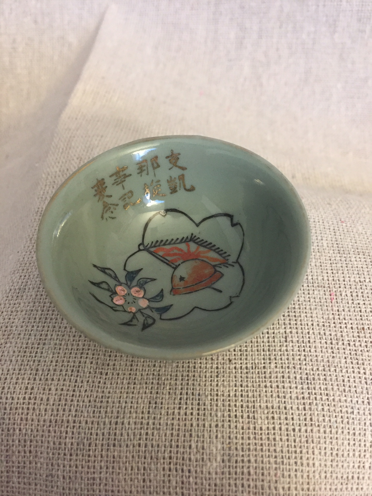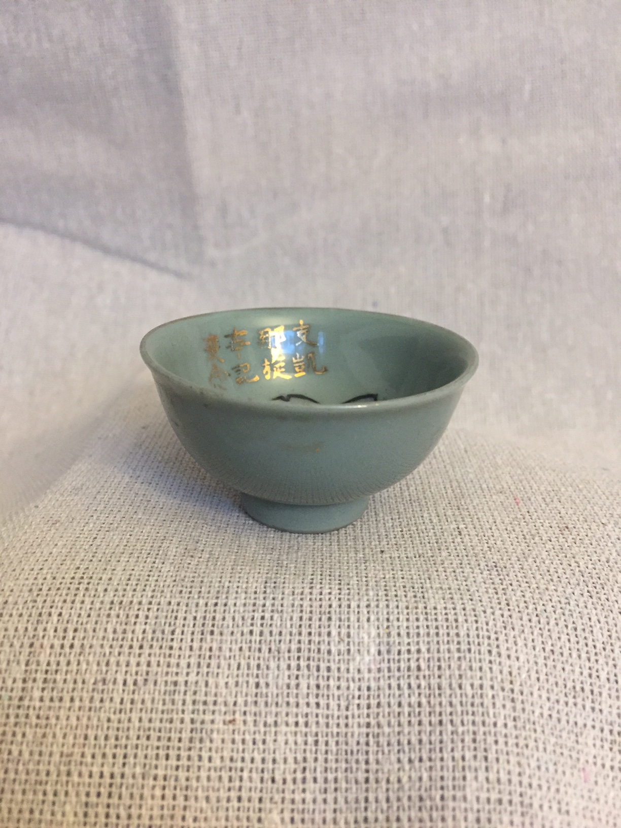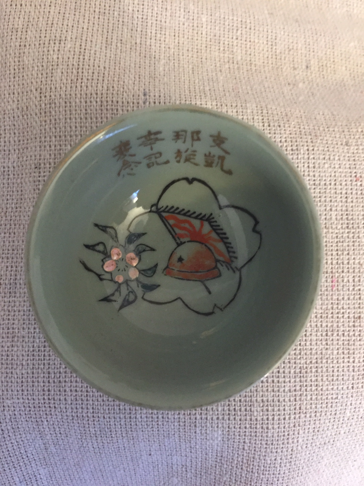 | Sake cups were commissioned by naval troops, pilots, tank crews, supply crews, infantrymen, cavalry men, telegraph and railroad engineers with an innumerable variation of colors and designs. Each cup is a mini time capsule with the owner\'s name and regiment inscribed, enabling the search for it\'s background and history of the person that drank from it. |