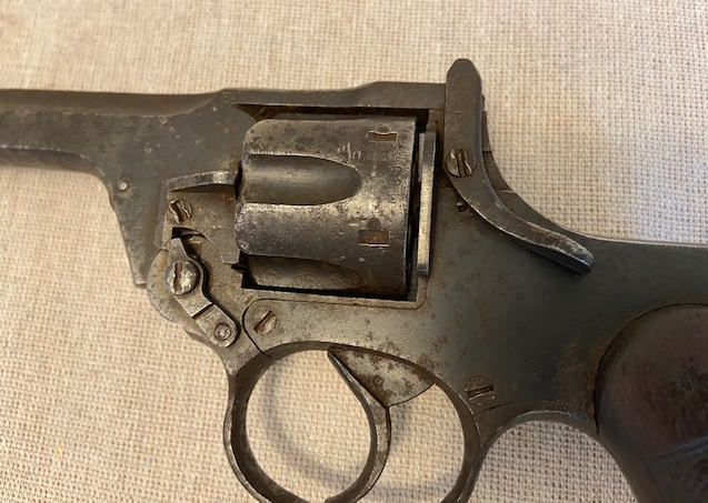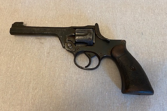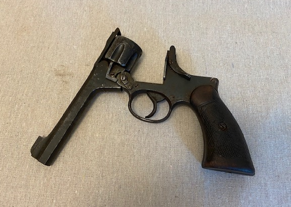 | A British top-break revolver using the .38/200 round manufactured from 1932 to 1957. This one is marked as having been produced in 1941, |