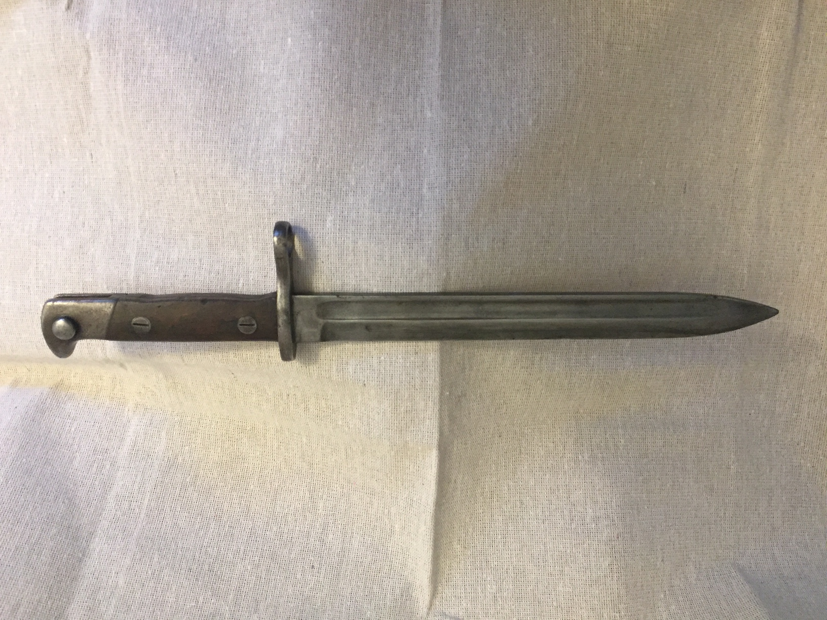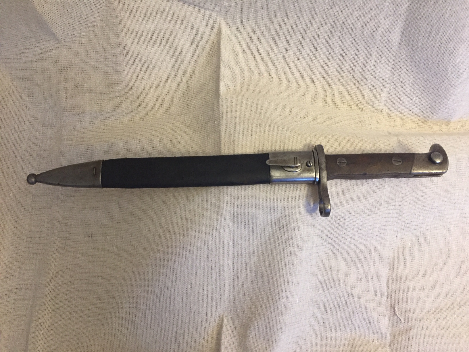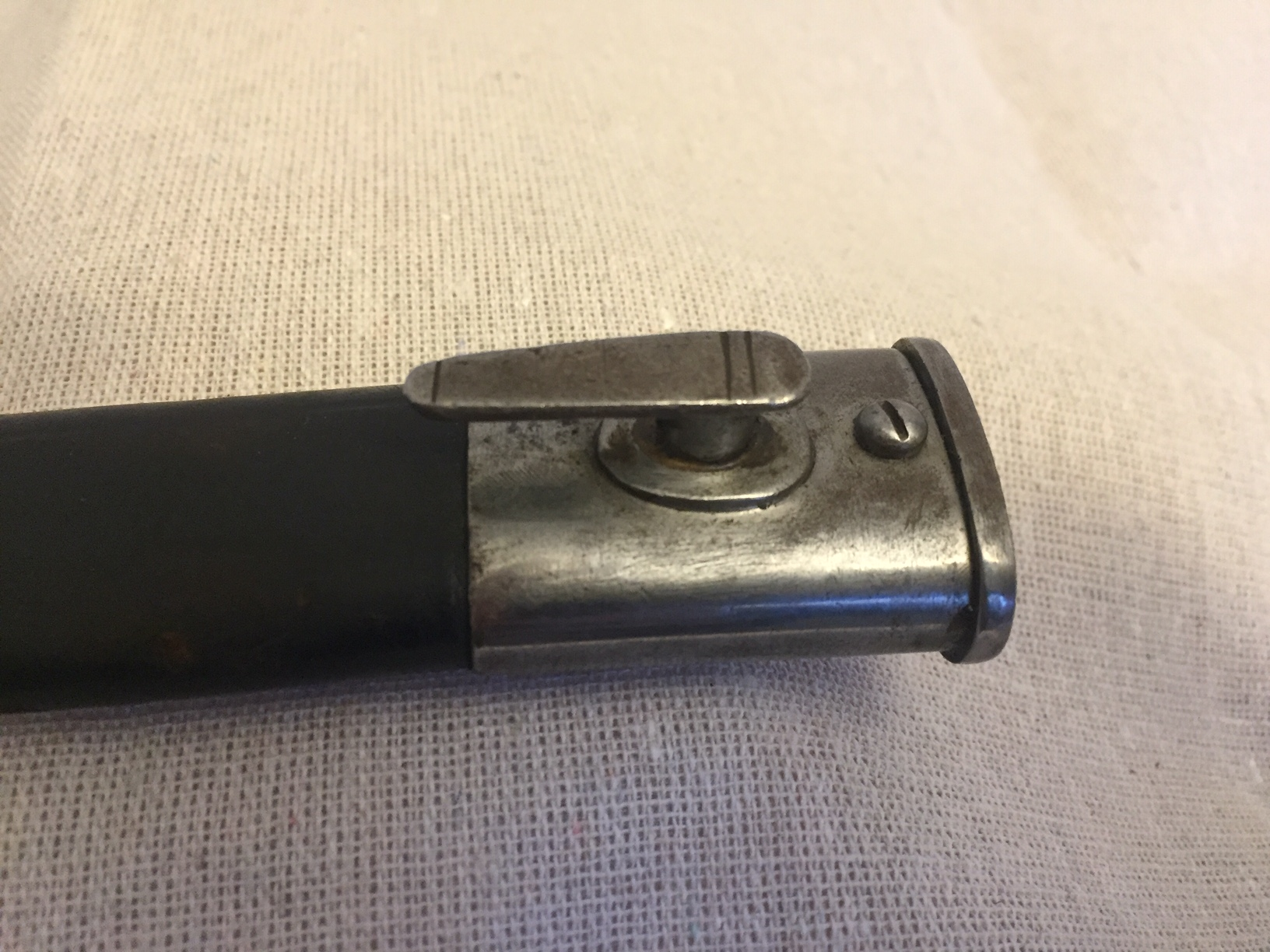 | German Made Mauser bayonet for the 1893 and 1895 Mauser rifles. Stamped with "Simpson and Co. Suhl Mfg". The blade is 10" long with 15" overall. This has the early leather scabbard with metal throat and tip. Serial number is stamped on cross guard. Blade is worn but not pitted. Grips have some dings and dents but not cracked. Press stud works fine. |