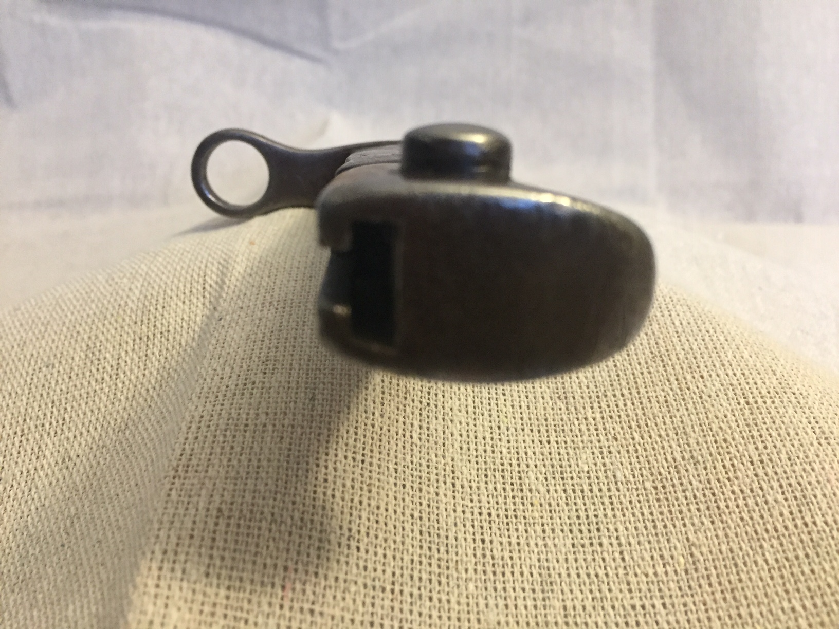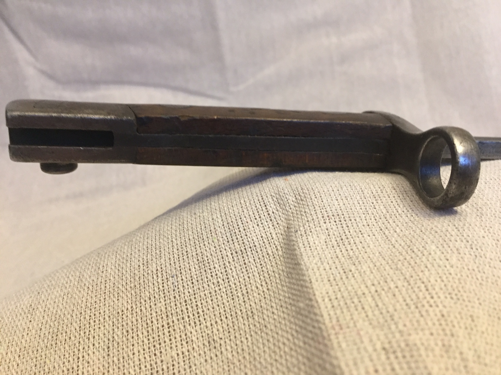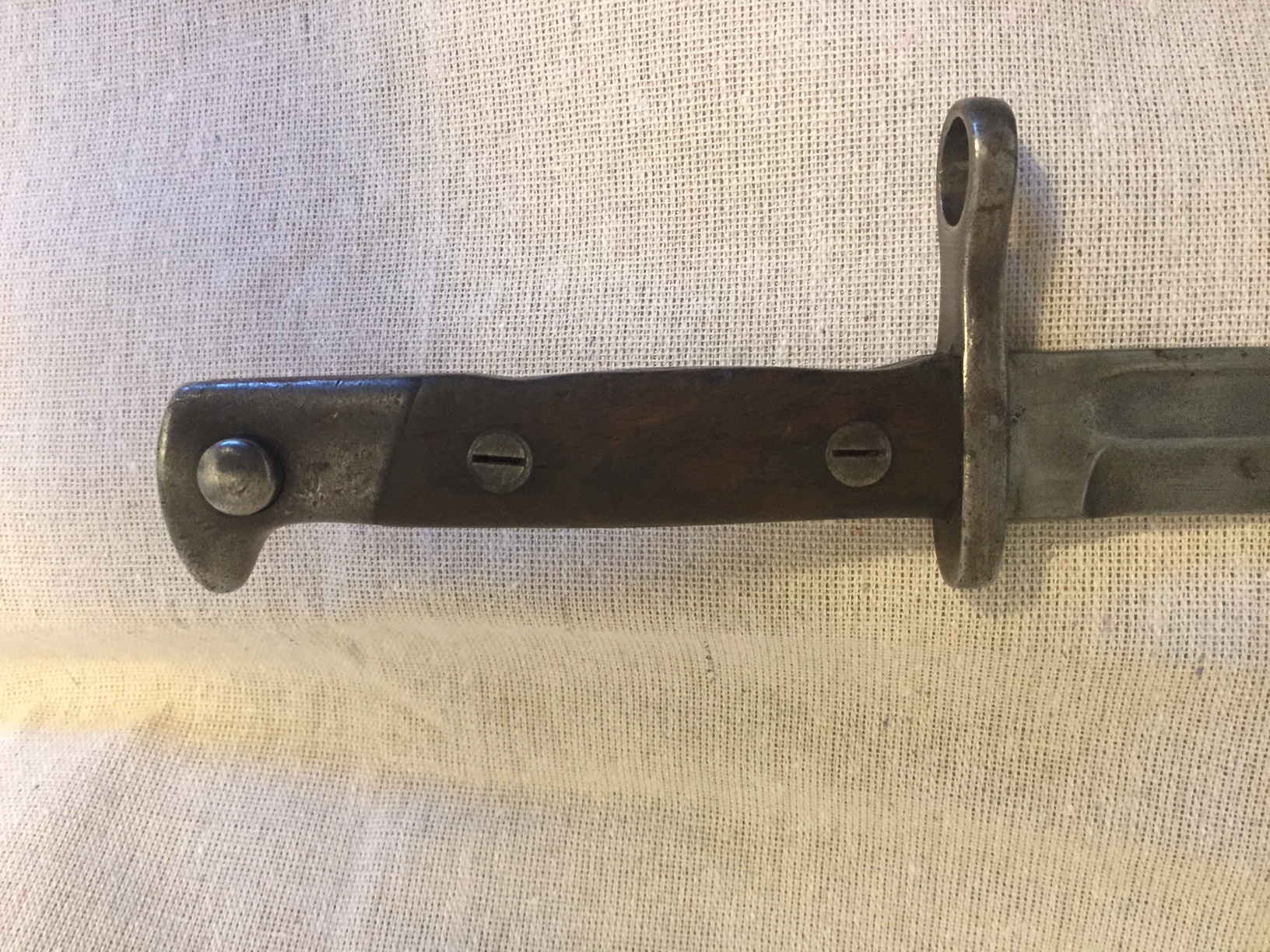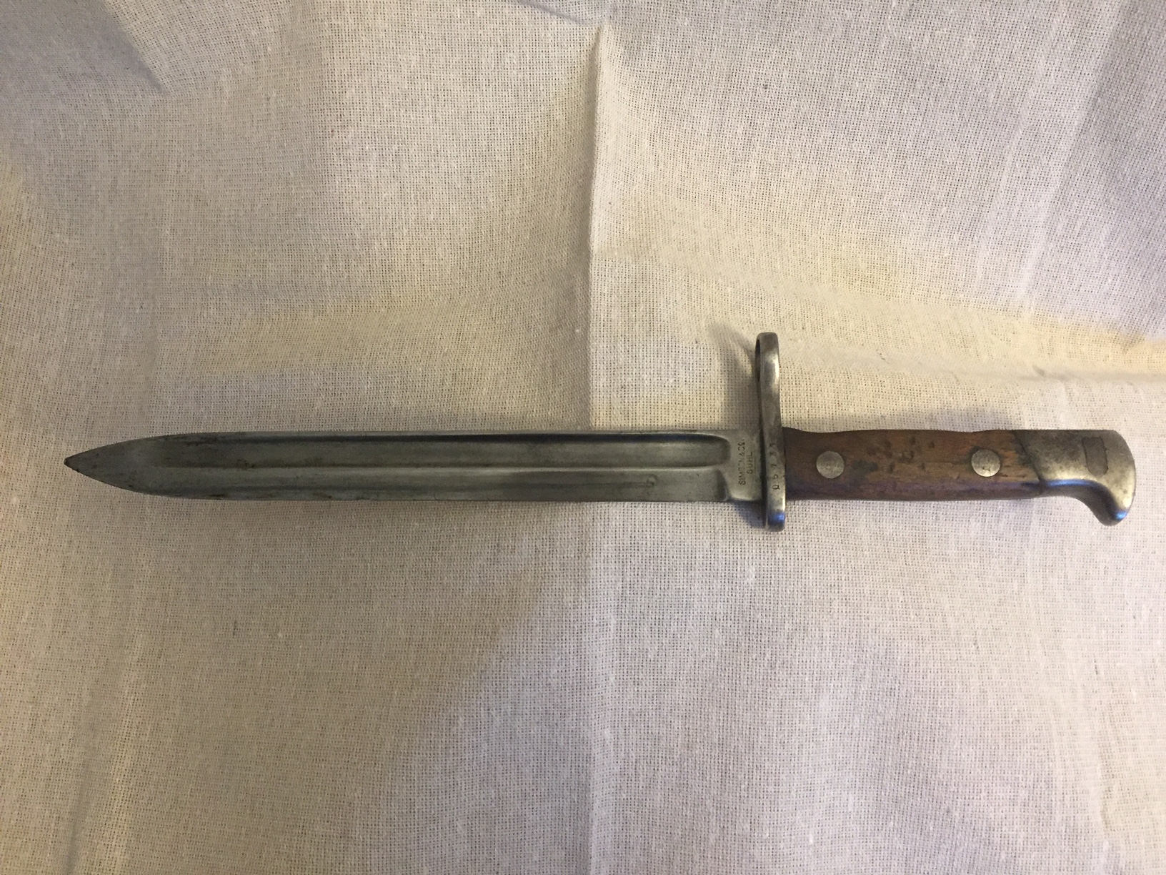 | German Made Mauser bayonet for the 1893 and 1895 Mauser rifles. Stamped with "Simpson and Co. Suhl Mfg". The blade is 10" long with 15" overall. This has the early leather scabbard with metal throat and tip. Serial number is stamped on cross guard. Blade is worn but not pitted. Grips have some dings and dents but not cracked. Press stud works fine. |