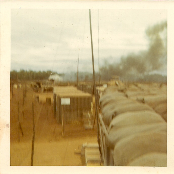 | Sandbagged Bunkers with Smoke Rising in the Distance |