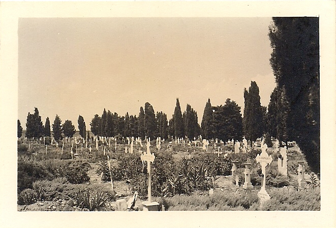 | Original WWII Snapshot photo of an Italian cemetery in the countryside near Bari, Italy. Descriptive note written on the back. Photo came from an airman in the AAF 32nd Depot Supply Squadron in Bari, Italy. This squadron served the 55th Bomb Wing (460th, 461st, 464th, 465th, and 485th Bomb Groups) based in the area. DATE: 1944-1945 SIZE: 2.5" x 3.5" SOURCE: From the archives of the World War History & Art Museum (WWHAM) in Alliance, Ohio. |