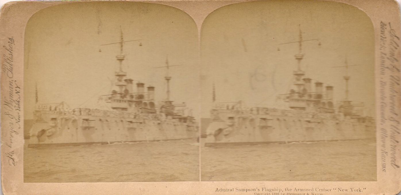 | Antique stereoview card featuring great naval scene of Admiral Sampson's Flagship. Dated 1898. Sold by Underwood & Underwood. Published by Strohmeyer and Wyman. They are 7" x 3 1/2" |