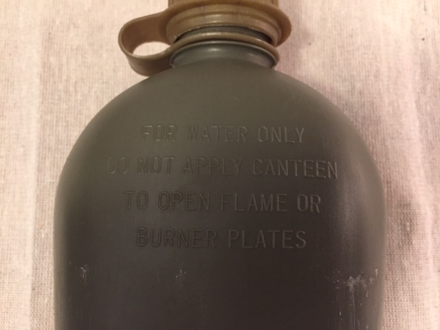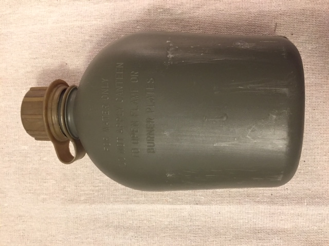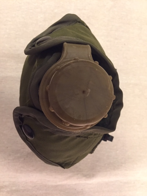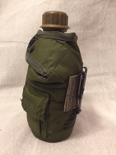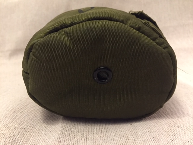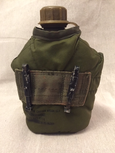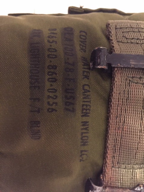 | The LC-2 canteen cover was made from OG-106 4-ounce nylon, with black snaps closing the cover flaps. The inside was lined with acrylic pile. The nylon cover holds the plastic water canteen with the nested metal Canteen Cup. Two ALICE clips were affixed to the back with a webbing patch. The nylon canteen covers have a small flap pocket, with Velcro closure, intended to hold a bottle of water purification tablets. An eyelet in the bottom of the cover provided drainage. NSN: 8465-00-860-0256 |